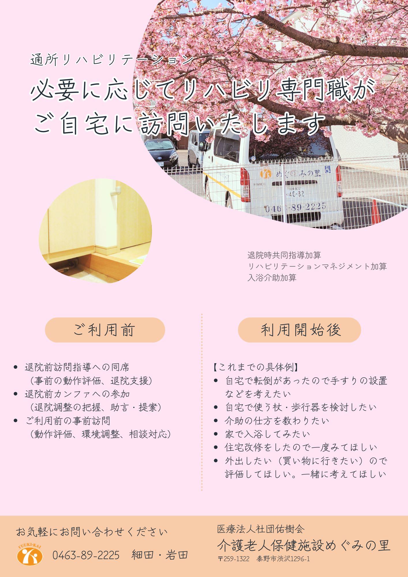めぐみの里の通所リハビリテーションをご利用の方やご入所されている方に対して、必要に応じてリハビリ専門職がご自宅に訪問しています。