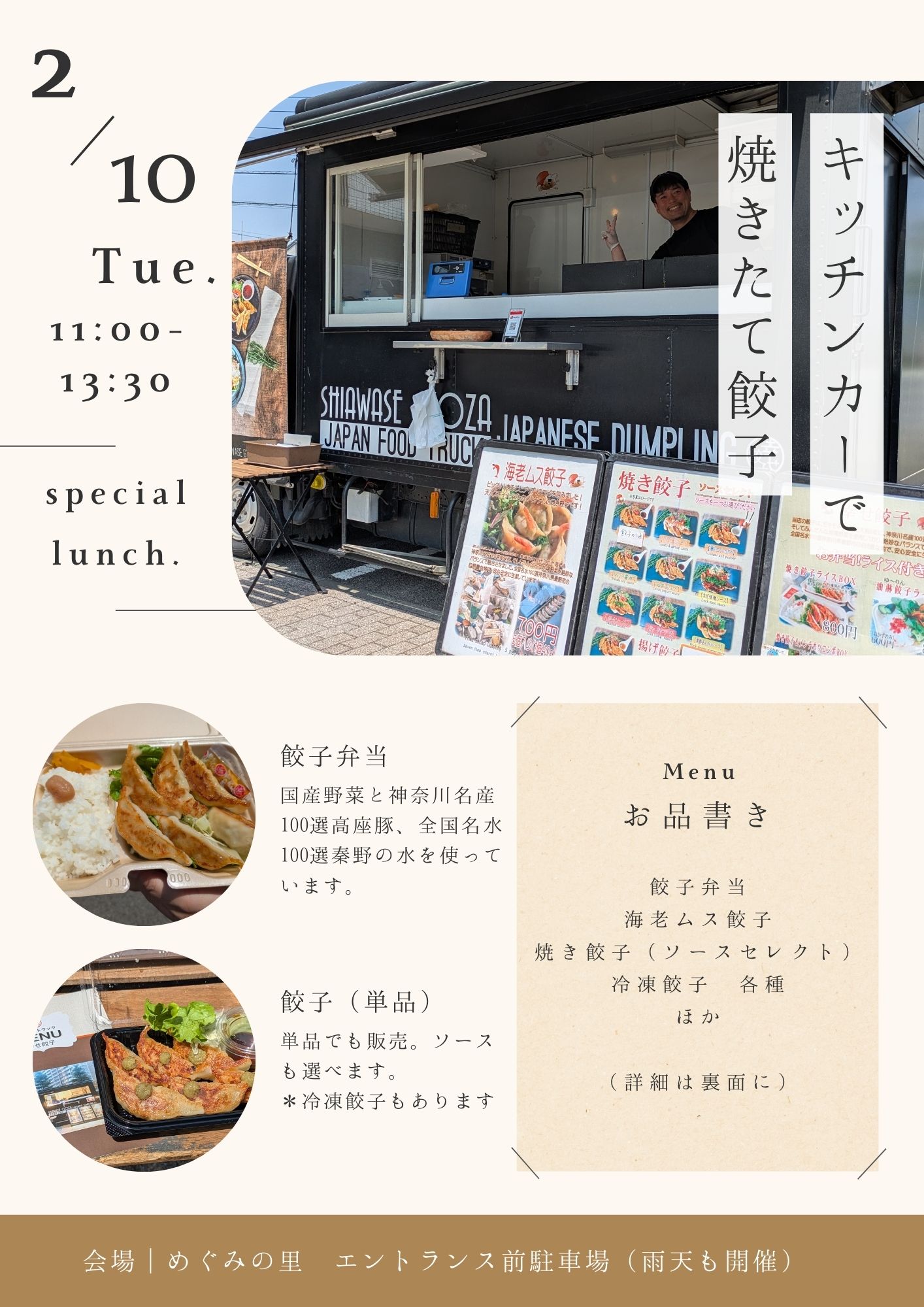 2026年2月のランチイベント(敷地内の公園で開催)は、焼き餃子と冷凍餃子(お持ち帰り用)の出張販売です。
